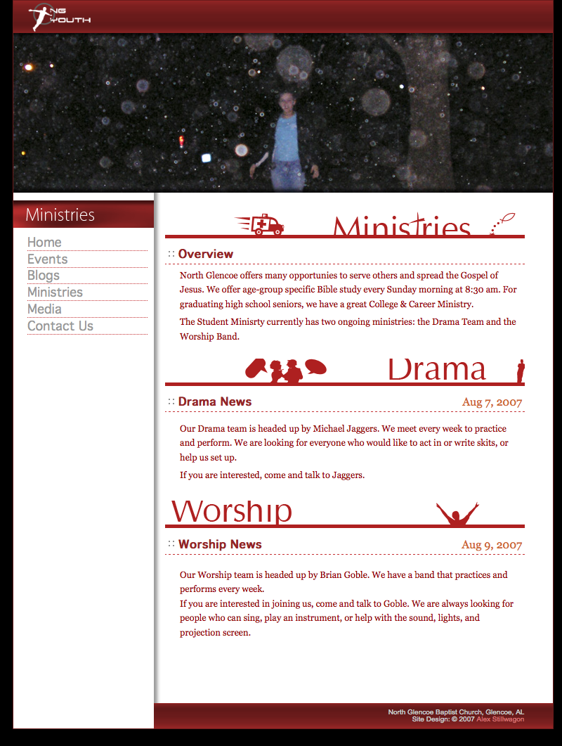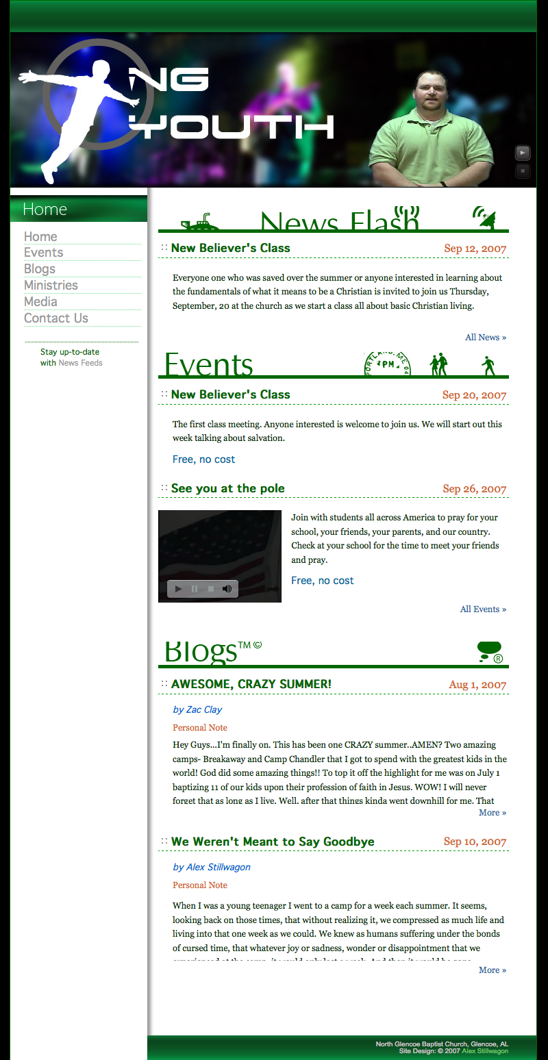 Custom coded CMS and site for the youth ministry of North Glencoe Baptist Church. The site features a blog, event calendar, and transparent video overlays. 2007