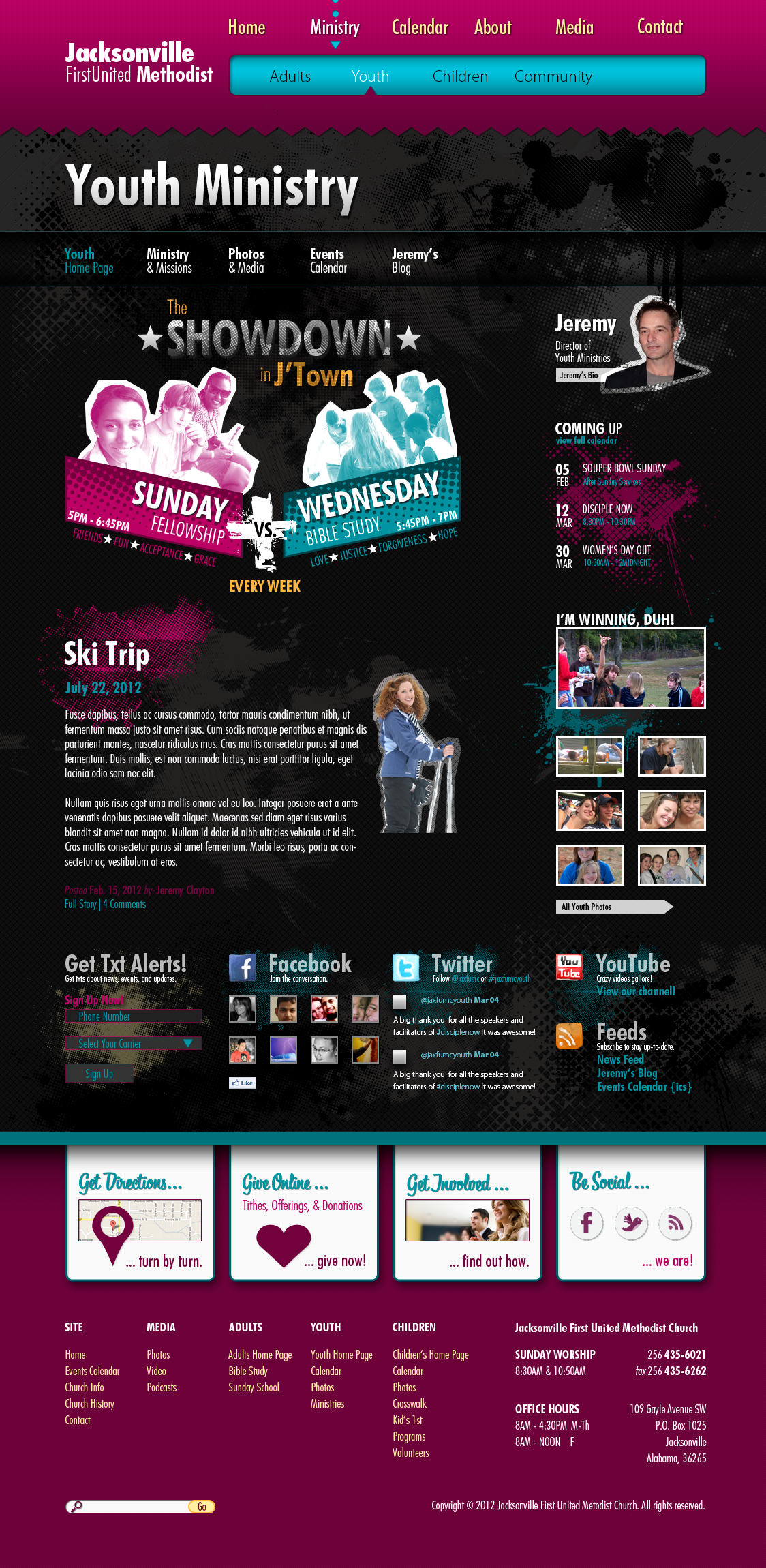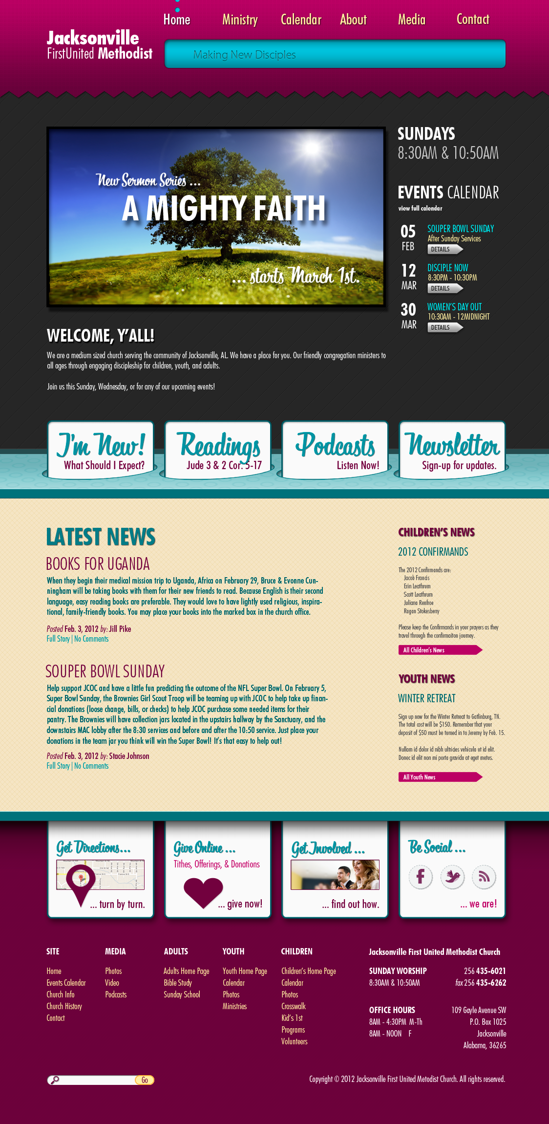 Design comp for First United Methodist Church Jacksonville, AL website redesign. Custom WordPress theme.