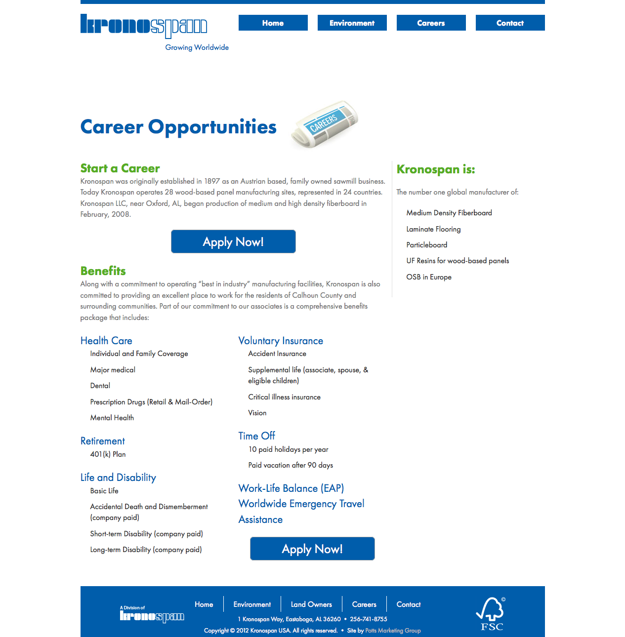 Website redesign for the KronoSpan USA of Oxford, AL. WordPress site with job posting and application system.